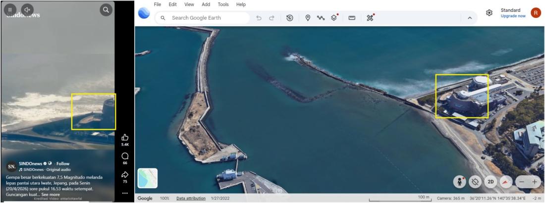 Video tersebut juga sesuai dengan citra satelit Google Earth dari Kota Oarai di Prefektur Ibaraki, yang terletak sekitar 450 kilometer di selatan Kuji -- di mana gelombang tsunami setinggi 80 sentimeter tercatat pada 20 April 2026 (tautan arsip).