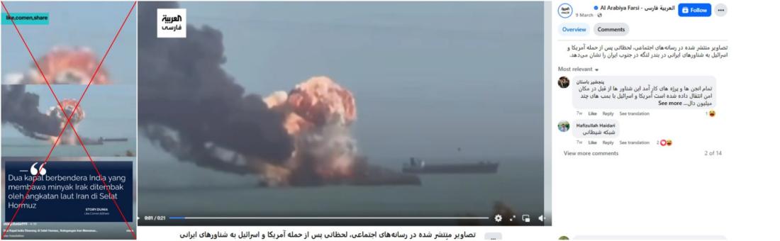 Pencarian gambar terbalik di Google menggunakan potongan gambar dari klip salah tersebut menemukan video yang dipublikasikan oleh stasiun penyiaran milik negara Saudi, Al-Arabiya, pada tanggal 9 Maret (tautan arsip). Video memperlihatkan ledakan yang sama, dengan diberi keterangan yang menyebutkan bahwa rekaman menunjukkan kapal Iran yang diserang oleh Amerika Serikat dan Israel.