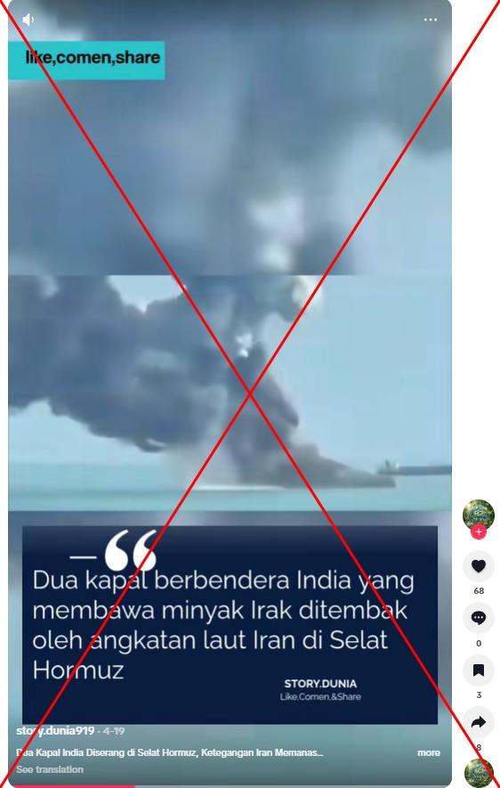 Video dengan klaim salah yang menyebut serangan Iran ke kapal India juga muncul dalam postingan serupa di TikTok