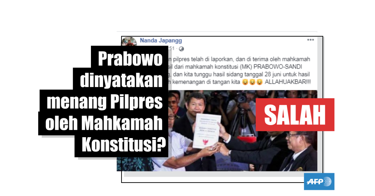 Namun, klaim bahwa Prabowo telah dinyatakan menang oleh MK itu salah.